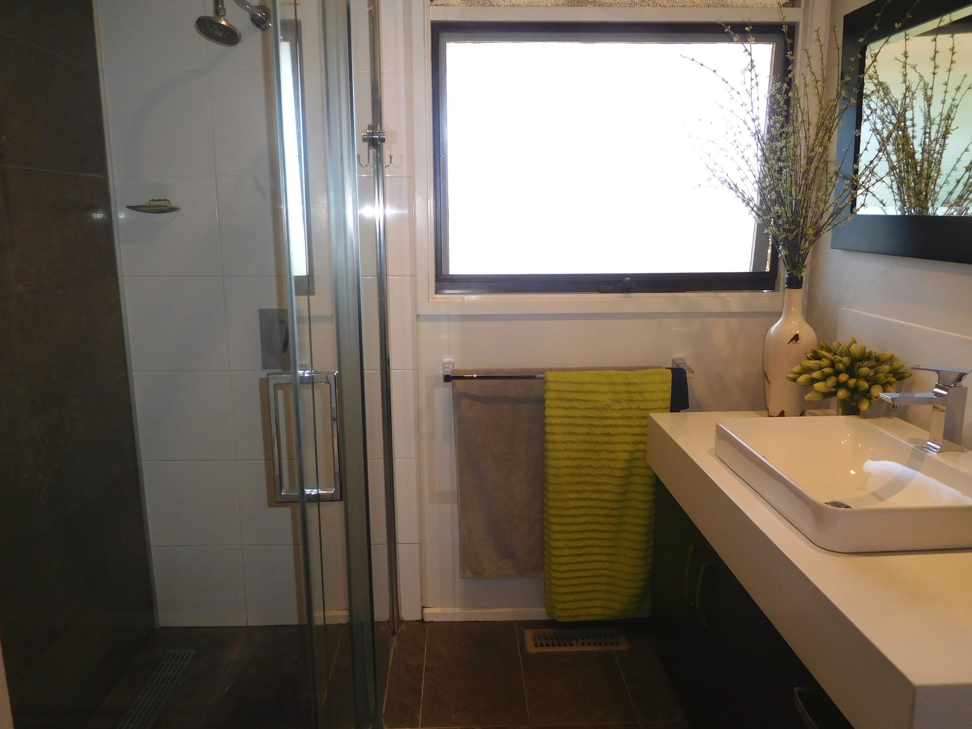 Large walk in shower in bathroom.